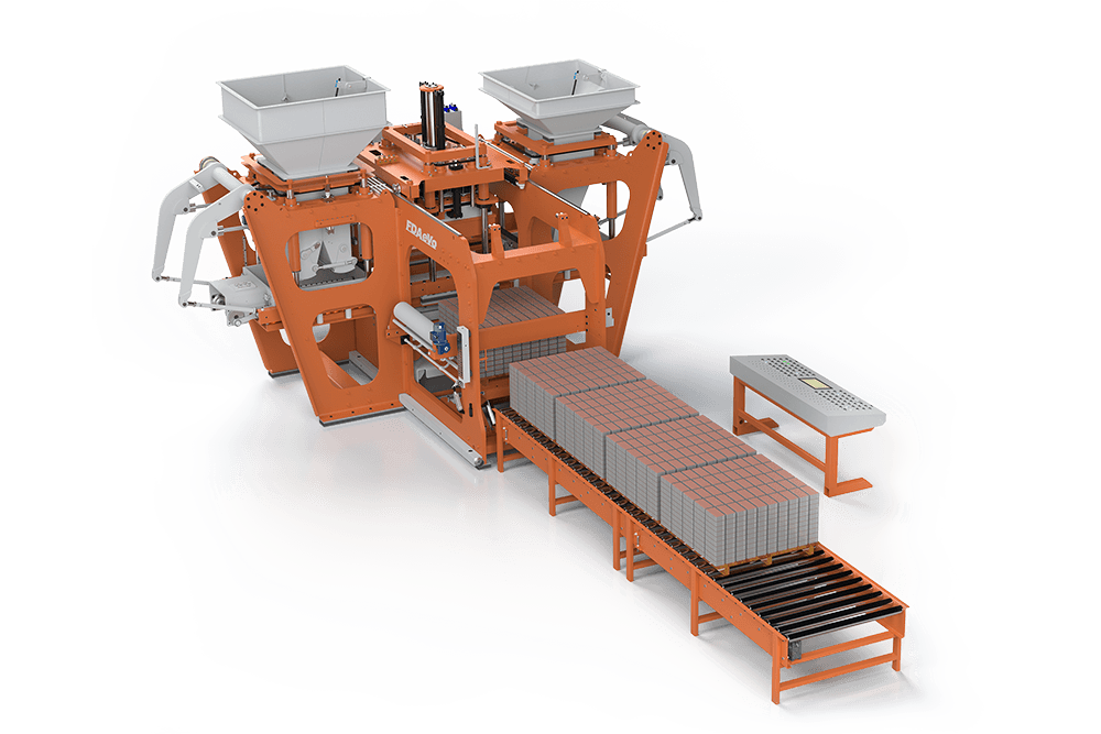Impianto minimo per la produzione di autobloccanti, composto dalla vibropressa e dalla sola linea uscita del prodotto. Possibilità ampliamento per una totale automazione.