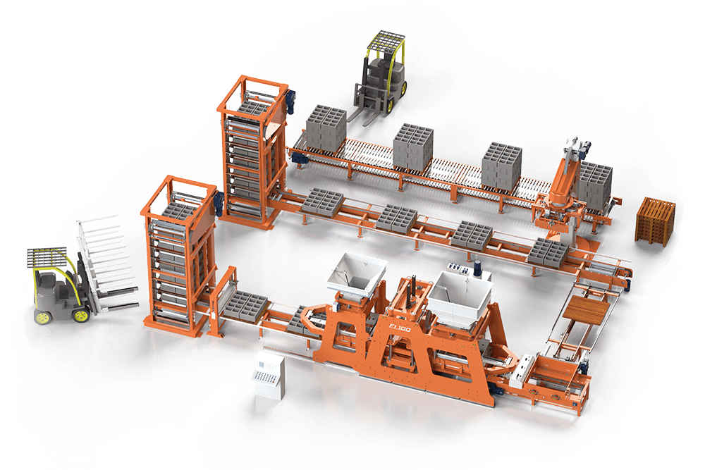 Questo impianto si può installare con più tipi di vibropresse con la possibilità di uno step successivo d’automazione e l’uso di carrelli trasbordatori del cliente.